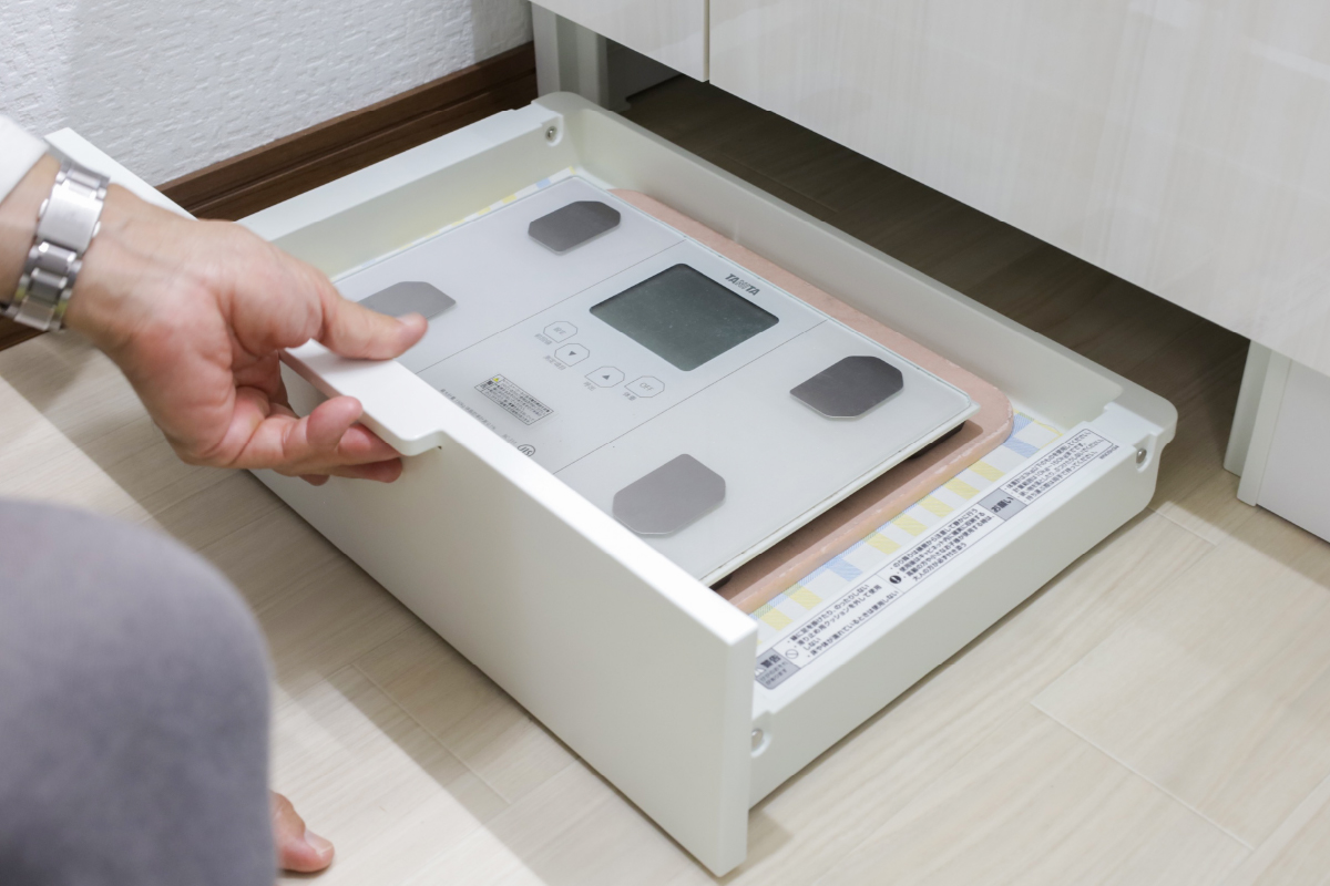 体重計って意外と邪魔になるじゃないですか。出しっぱなしで汚したり水かかったりしたくないし置き場にすごく悩むんですよね。引っ張り出してこのまま乗れて、そのまま突っ込められるのは画期的です。