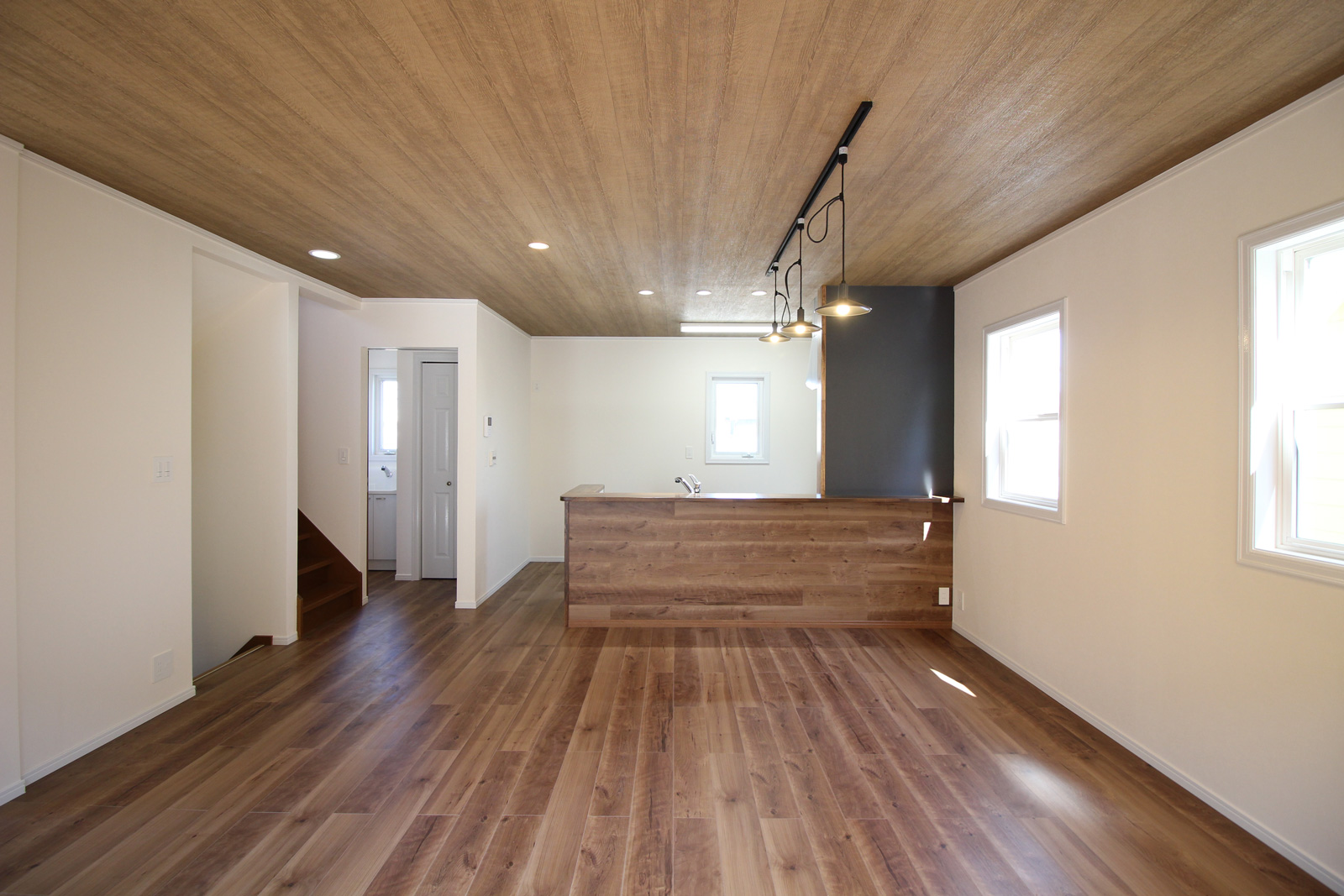 LDK側。天井と床にウォールナット調のフローリングを使用し、フローリングをそのままキッチンの腰壁にも使用したことで、一体感が生まれモダンな印象になりました。