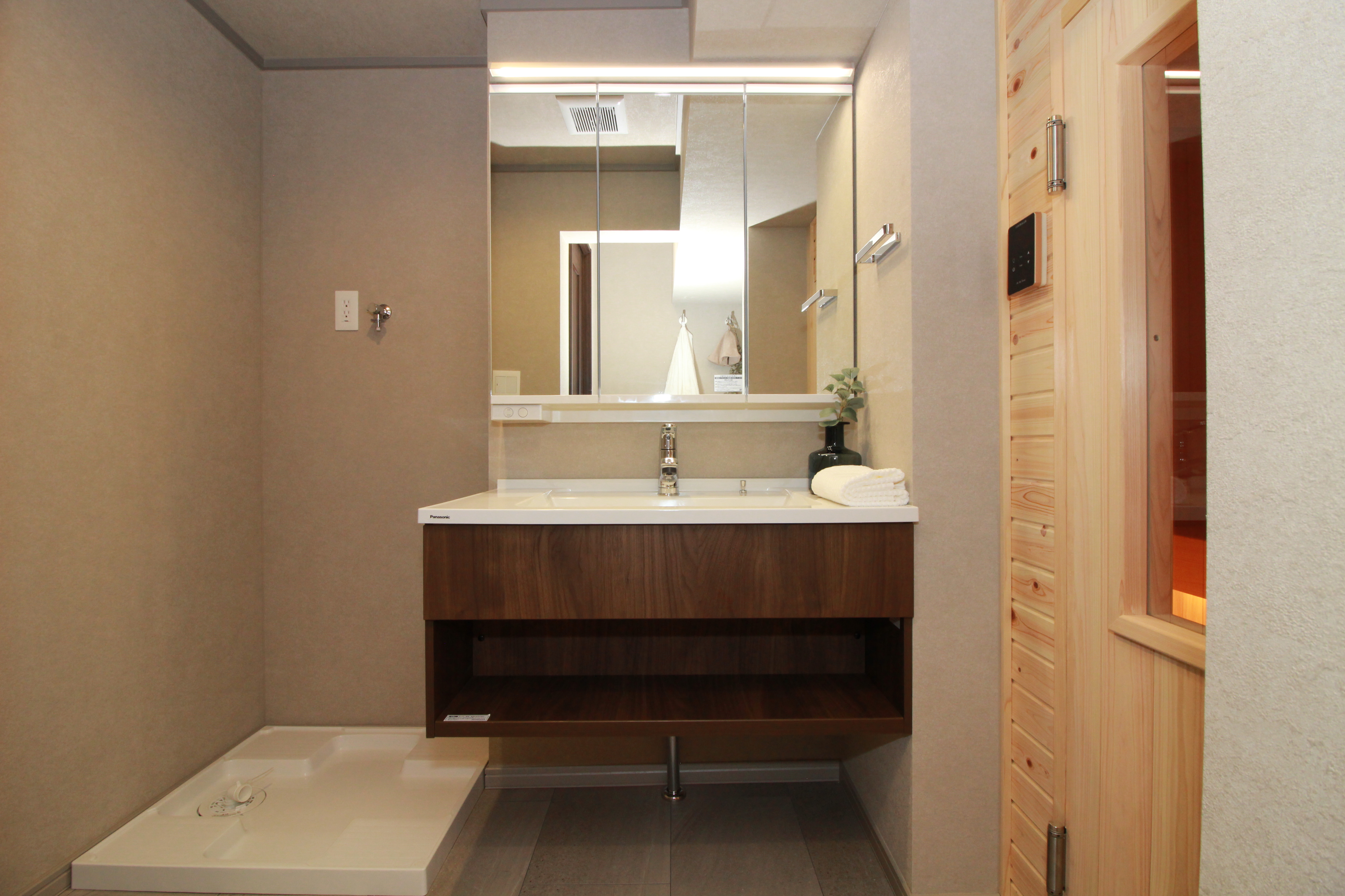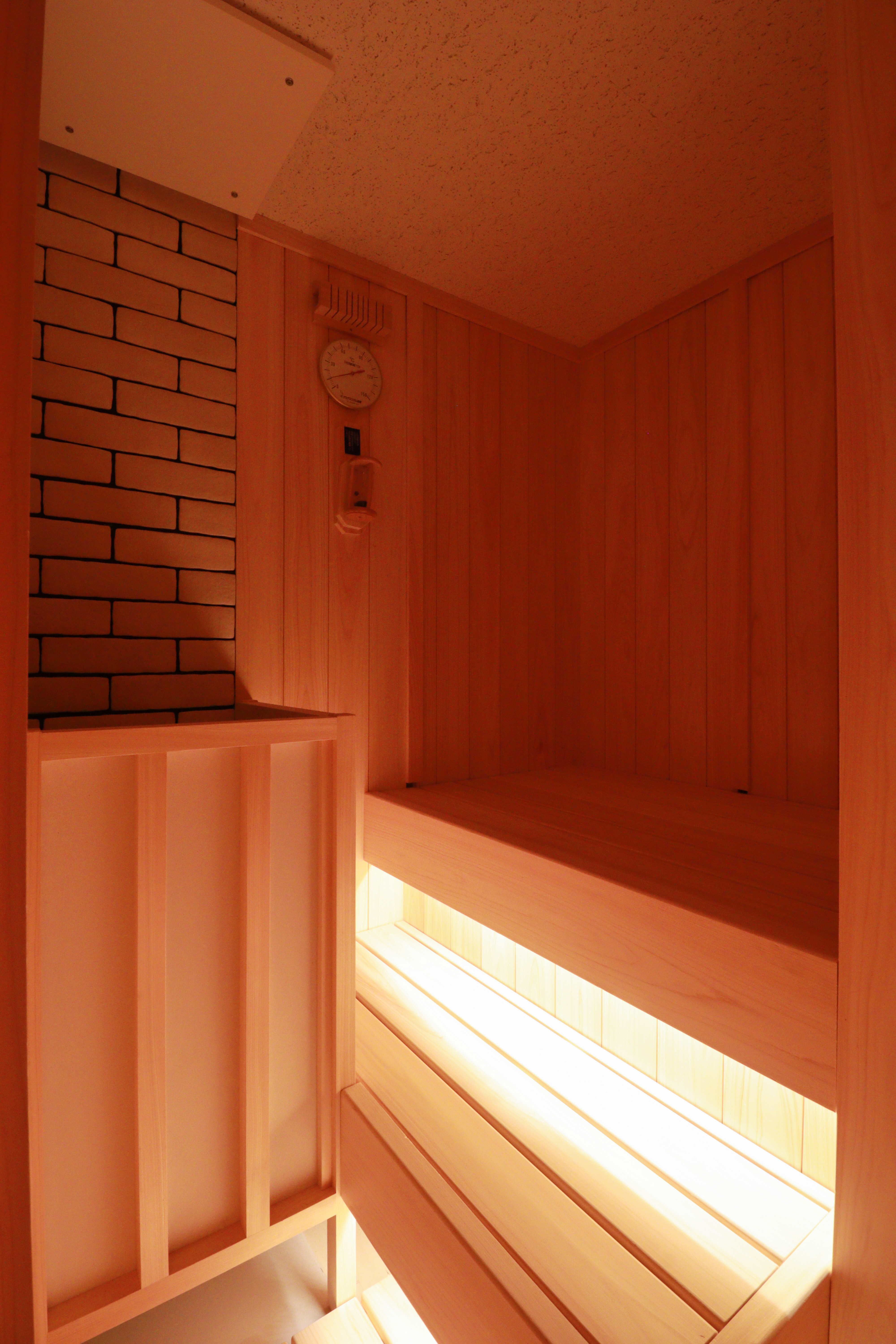 浴室周りは大きく間取り変更を行い、元々あったお風呂場を解体し、ビルドインのサウナを設置しています。