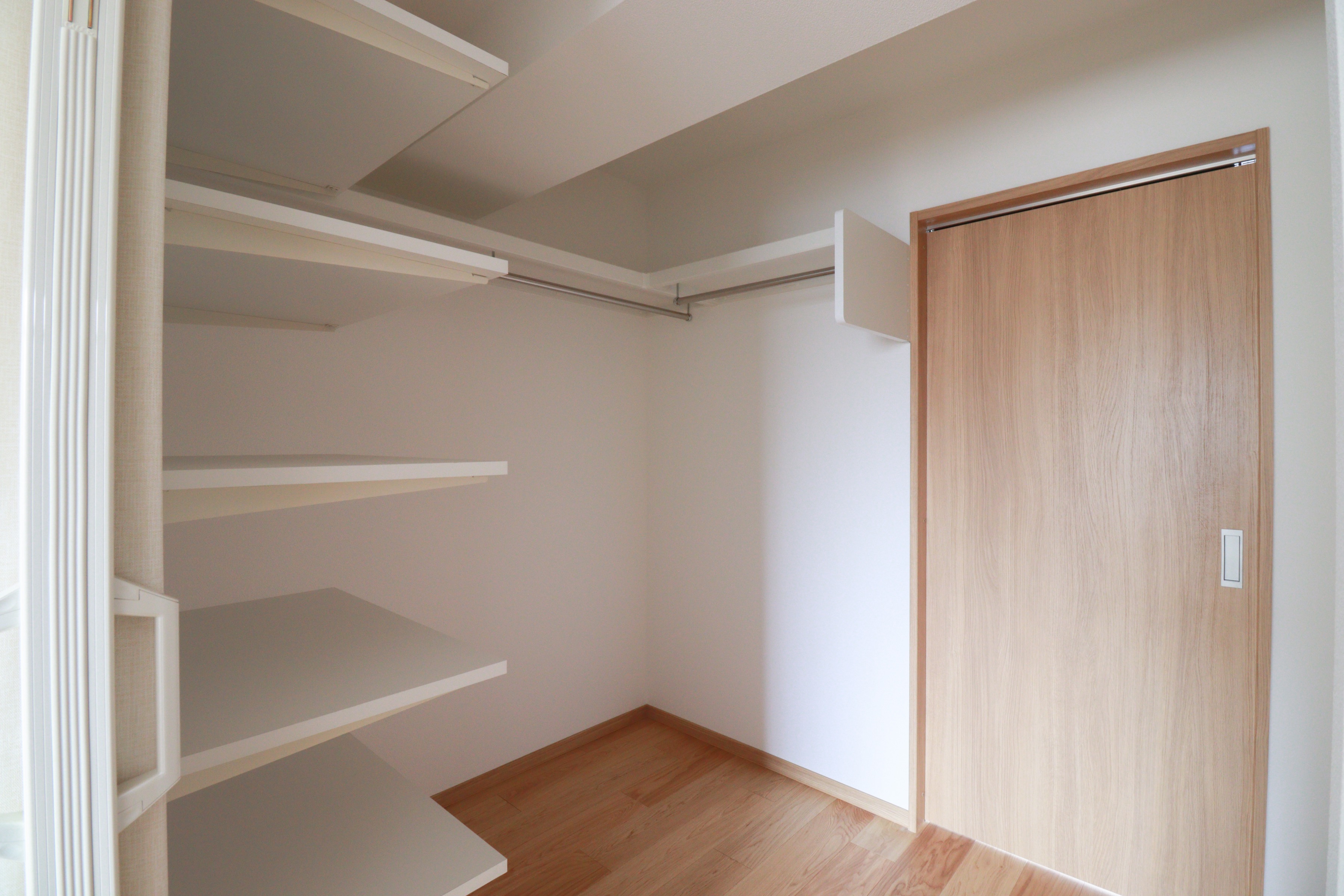 隣の洋室の一部を取り込むことで、広々とした収納スペースを確保し、反対側の部屋からもアクセスできるようにしたことで、利便性が大幅に向上しました。