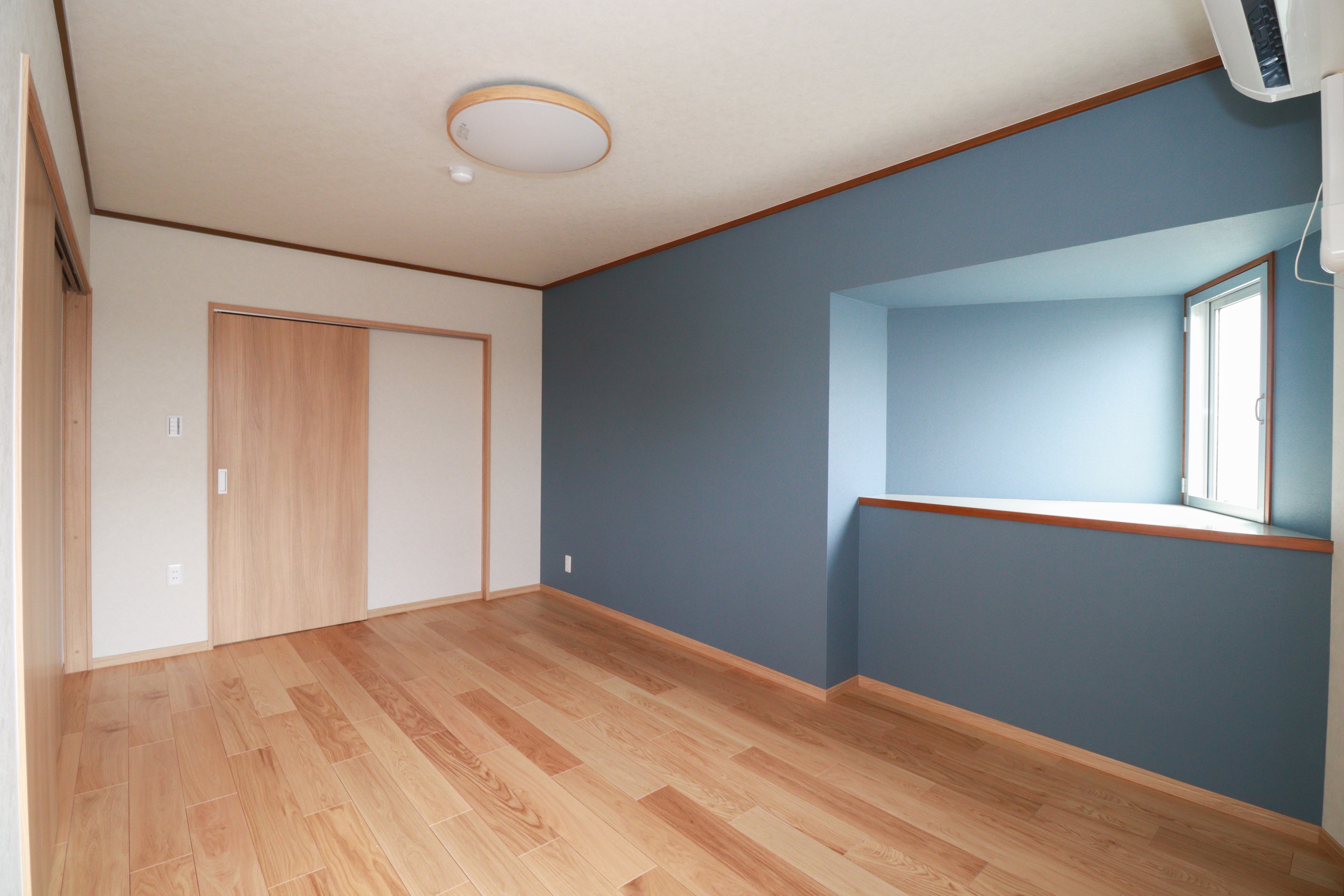 ブルーのアクセントクロスが、落ち着いた雰囲気を演出しながら、空間に新しい個性を加えています。
