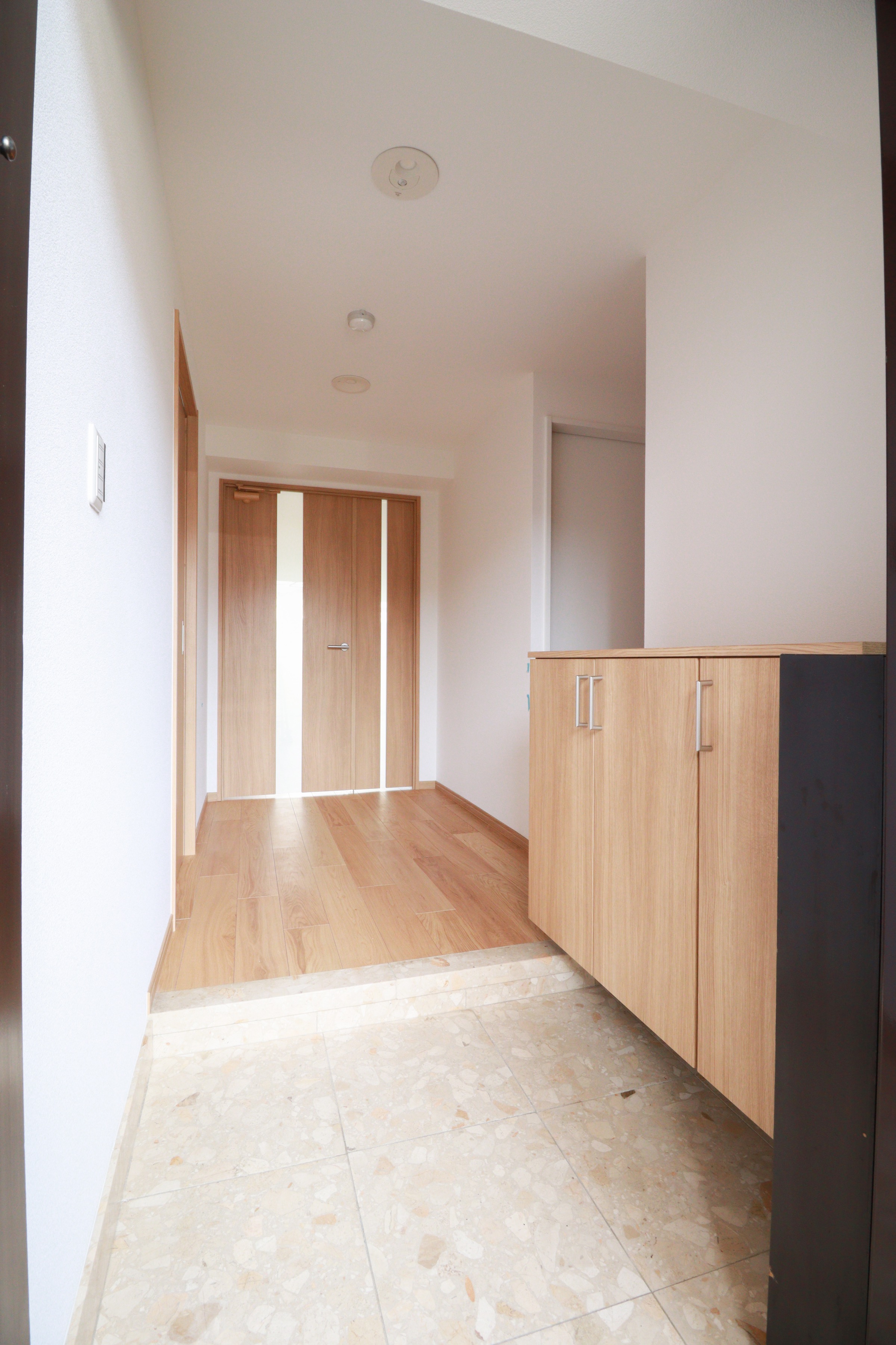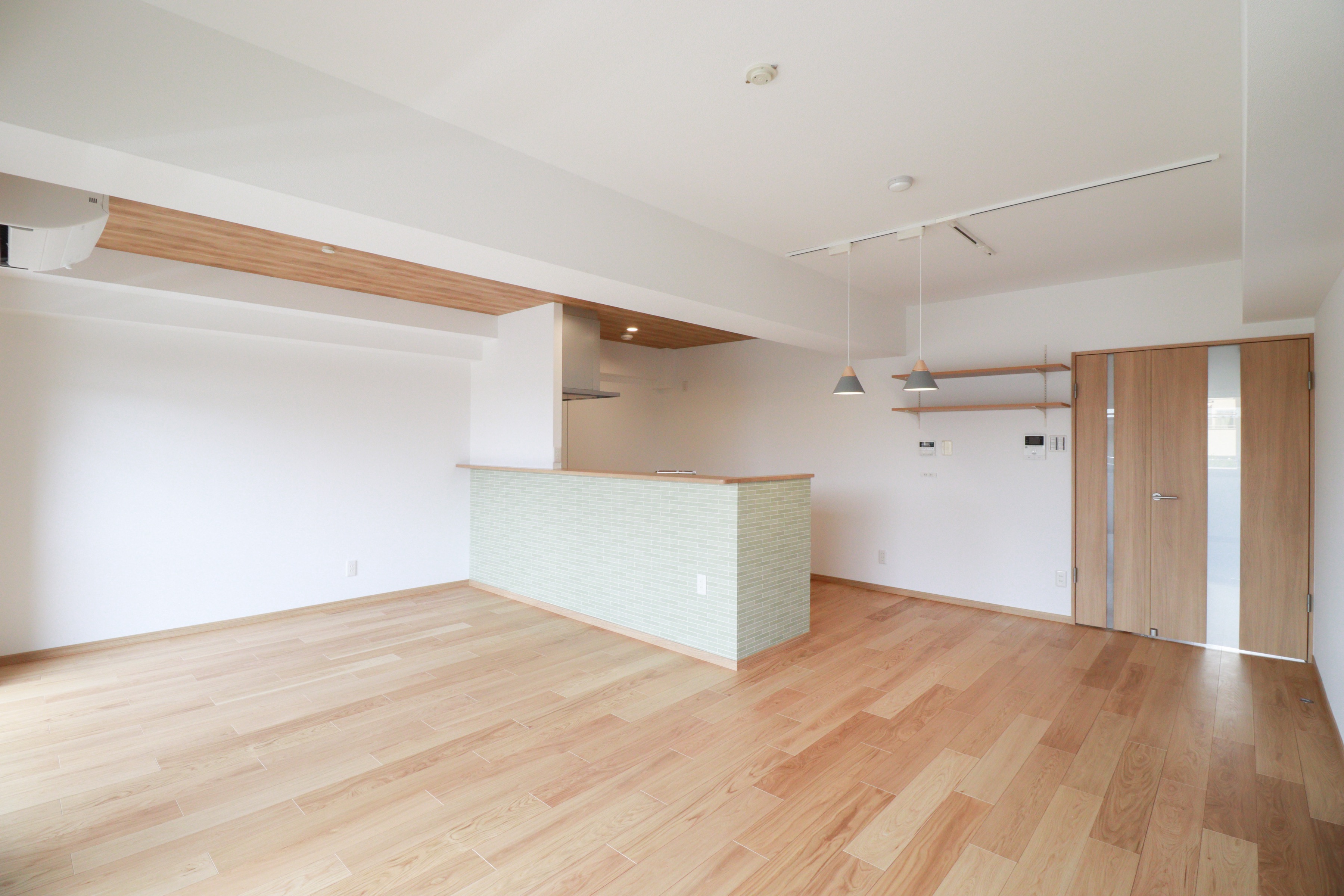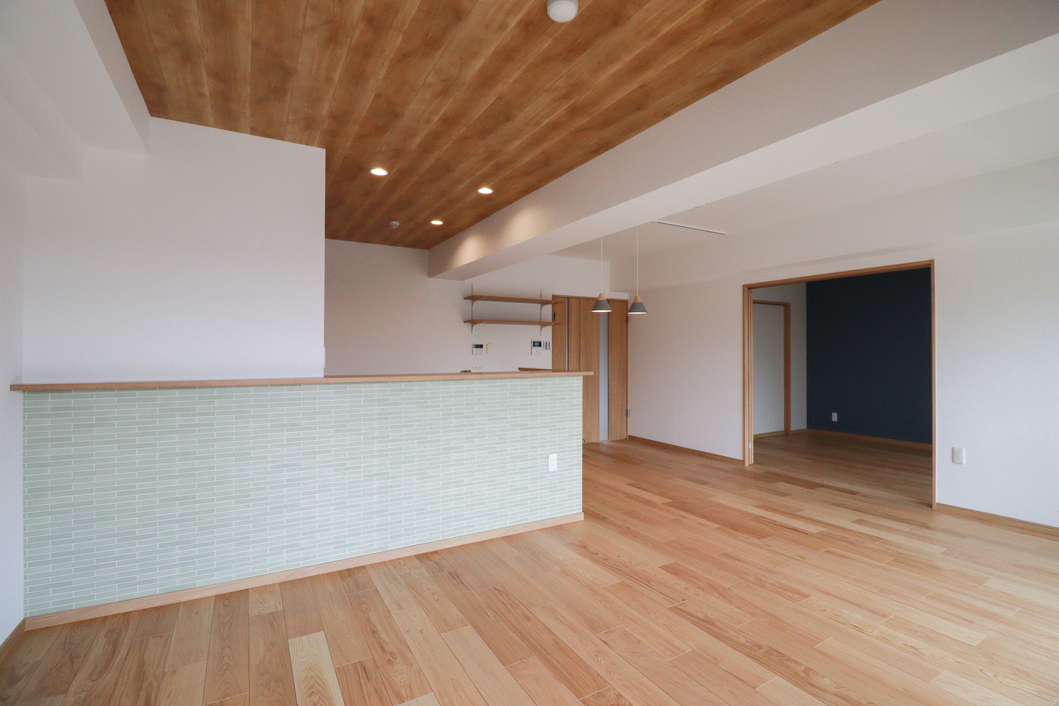 白のクロスと温かみのある木目調の建具、そして天井の一部に施された木目クロスが調和し、心地よい空間を作り出しています。