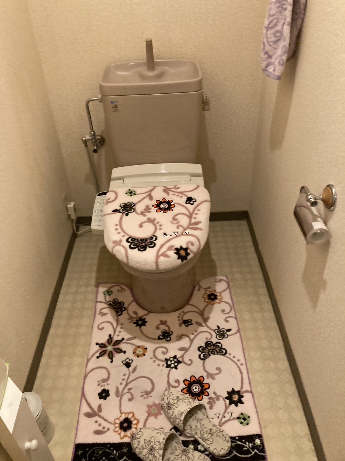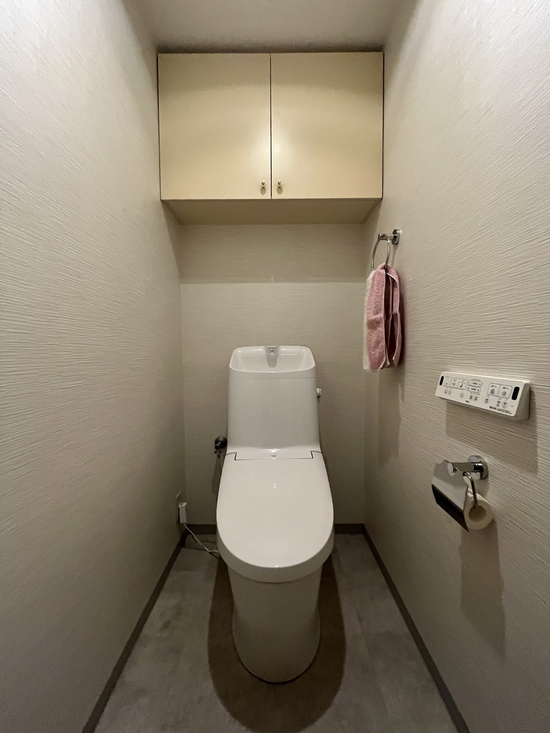 既設の吊り戸棚を再利用したため、空間の雰囲気に合うクロスを丁寧に選定されました。床材にも高級感のあるものを採用し、全体に一体感が生まれ、落ち着きと上質さを感じられるトイレ空間に仕上がっています。使い勝手だけでなく、見た目の心地よさにも配慮した、快適で居心地の良い空間です。