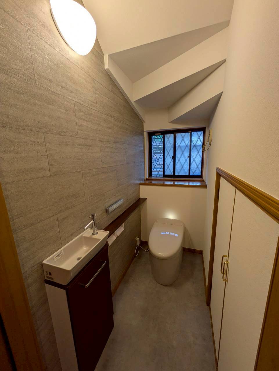 あわせて独立型の手洗い器を新設し、無理のない姿勢でしっかりと手が洗える利便性を確保。凹凸の少ないトイレと専用手洗いの組み合わせで、日々のお手入れもぐっと楽になり、清潔感を保ちやすい実用的なレストルームが完成しました。