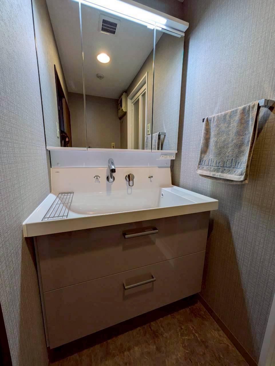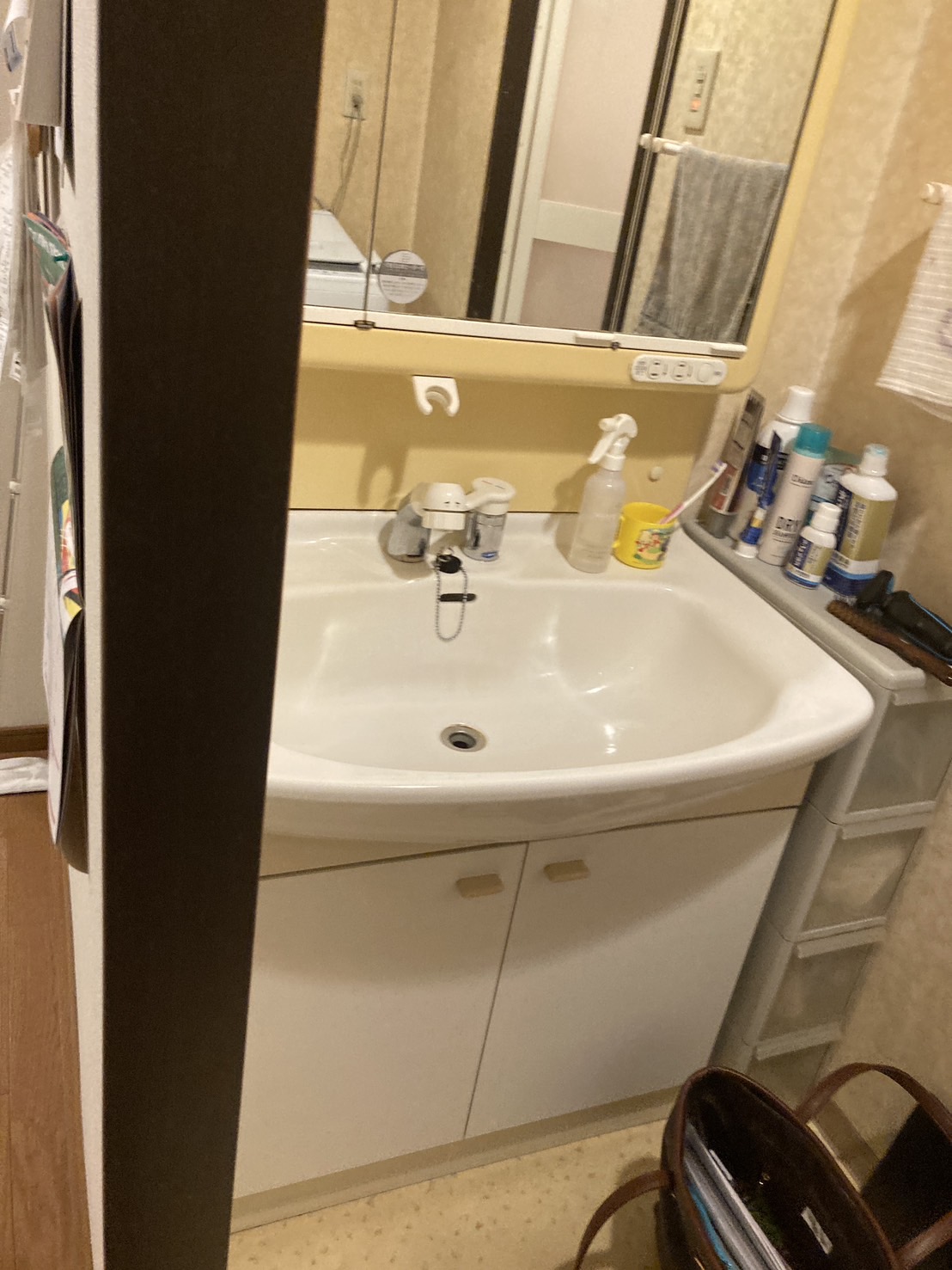 洗面本体の大きさは変わらないのですが、ボウルが大きく、深くなった事で作業効率がグンと上がりました。水栓が壁出し水栓になった事で根本も汚れずらく清掃性も向上しました。